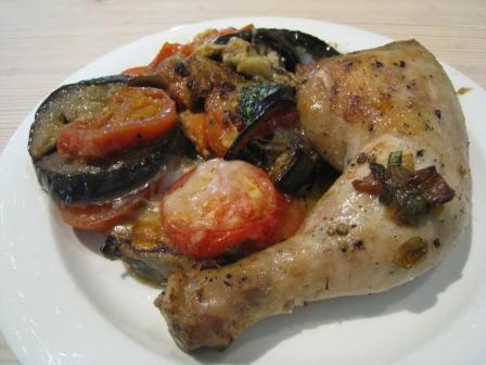 Han hade sex kycklinglår som han stekte i smör, innan han kryddade dem och satte dem i ugnen. Till kycklinglåren gjorde han en gratäng av skivad aubergin eller äggplanta, mozzarellaost, skivad tomat och lagrad holländsk ost. Gratängen lade han sedan i ugnen, med kycklinglåren ovanpå, för ca 45 minuter. Det var supergott!